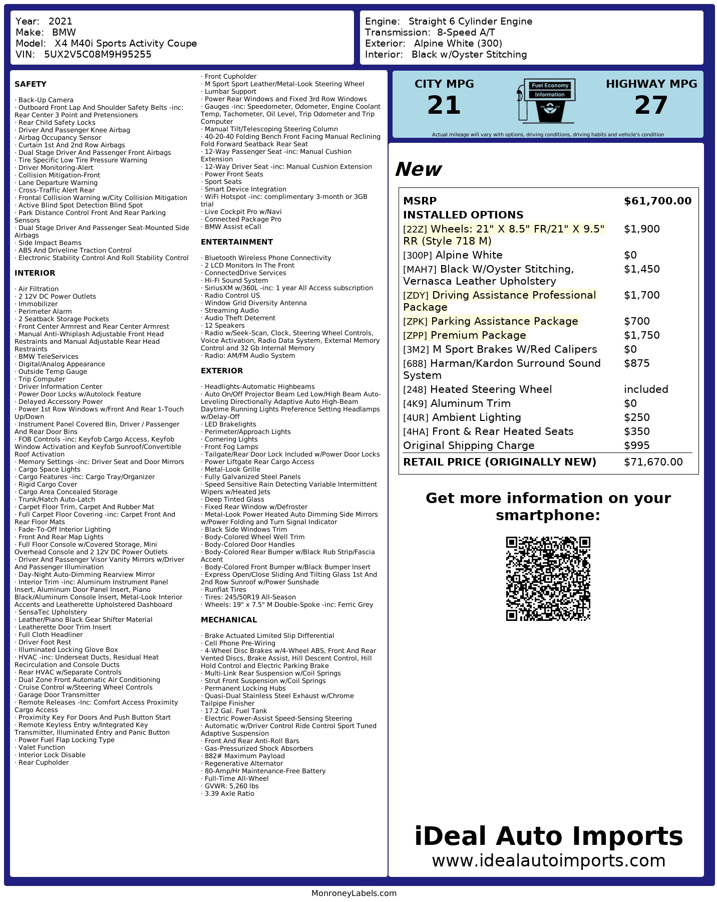 This 2021 BMW X4 M40i is a 1-owner, non-smoker, no-accident personal vehicle with a great service history, available now at iDeal Auto Imports in Eden Prairie, Minnesota, near Minneapolis. Finished in Alpine White with Black Vernasca leather upholstery with Oyster stitching, this sporty luxury SUV is loaded with premium features including the Driving Assistance Professional Package with adaptive cruise control with stop & go and Active Driving Assistant, plus the Parking Assistance Package with Surround View 3D, Parking Assistant Plus, Active Park Distance Control, and rear view camera. The Premium Package adds head-up display, gesture control, heated front seats, and a heated steering wheel, while performance upgrades include M Sport brakes with red calipers and the Harman/Kardon surround sound system. Additional highlights include front and rear heated seats, ambient lighting, and aluminum interior trim. All vehicles at iDeal Auto Imports are stored indoors, fully inspected, include a free CARFAX report, offer easy financing, and nationwide shipping is available. Call or text 952-833-9000 today to schedule your test drive.