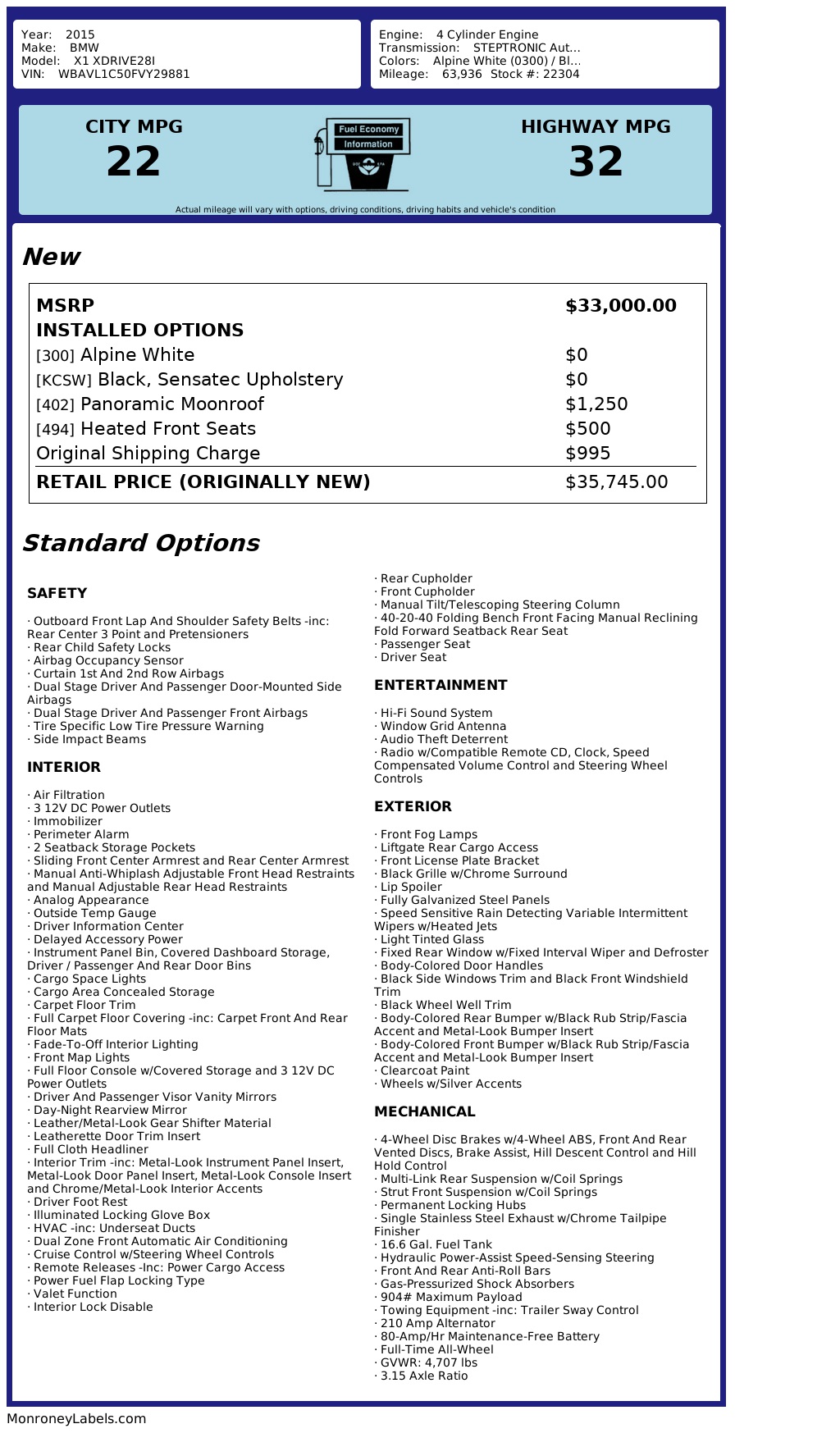 This 2015 BMW X1 xDrive28i is a non-smoker, prior Certified Pre-Owned luxury SUV finished in Alpine White with a Black Sensatec interior, now available at iDeal Auto Imports. Known for its sporty handling and all-wheel-drive confidence, this X1 offers a perfect blend of performance, efficiency, and everyday practicality. Well equipped with desirable features including a panoramic moonroof, heated front seats, multi-zone climate control, Bluetooth connectivity, fog lamps, hard drive media storage, and keyless start. Additional highlights include integrated turn signal mirrors, rain-sensing wipers, premium synthetic seating, and a tire pressure monitoring system for added safety and comfort. If you're searching for a BMW X1 for sale in Eden Prairie, a compact luxury SUV near Minneapolis, or a reliable BMW xDrive all-wheel-drive vehicle in Minnesota, this X1 checks all the boxes. Thank you for choosing iDeal Auto Imports. We specialize in import auto sales since 2010. All of our vehicles are stored indoors, fully inspected, and include a free CARFAX report. Easy financing available, and nationwide shipping can be arranged. Call or text 952-833-9000 today to schedule your test drive!